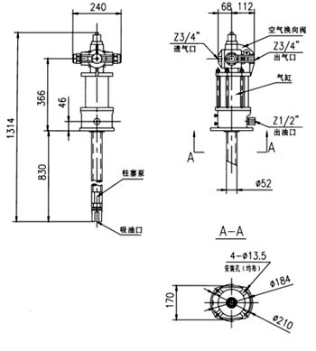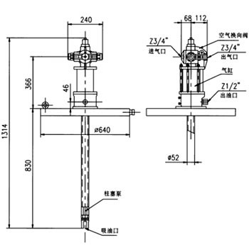三、使用要領 1、本泵應安裝在專用桶蓋上(200L桶蓋本公司另有供貨),將泵管垂直插入200L的油桶內。 2、進氣管路上必須配接氣源處理三聯(lián)件。 3、使用2#油脂或高稠度潤滑油時,油桶內必須配用壓油板(本公司另有供貨)。 4、建議供氣量調定在泵工作頻率在40~50次/min范圍內為宜,嚴禁超過60次/min使用,以免損壞內部運動件。 5、排氣口配接消氣器(用戶自備,接口Z3/4)。