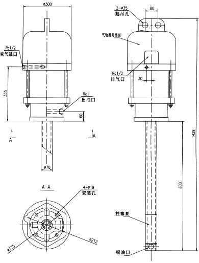 1、以托架(用戶自備)作支承,用四只M16的螺栓把氣動(dòng)泵固定在托架上,柱塞泵管垂直插入貯油箱的油脂中。