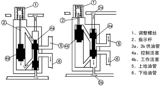 如上圖所示,由泵輸送來的潤(rùn)滑脂,經(jīng)供油管3a進(jìn)入分配器控制活塞的上端,控制活塞首先向下移動(dòng)(這時(shí)控制活塞下端擠壓的潤(rùn)滑脂則進(jìn)入卸荷的供油管3b),使工作活塞的上腔與控制活塞的上腔連通,然后工作活塞向下移動(dòng),這時(shí)受工作活塞的擠壓的潤(rùn)滑脂經(jīng)過控制活塞的環(huán)形槽被壓送到出油口6至潤(rùn)滑點(diǎn),完成第一周期的給油動(dòng)作。切換至供油管3b供油開始第二周期的給油動(dòng)作,分配器活塞按相同的順序反向進(jìn)行前述動(dòng)作,出油口5排送潤(rùn)滑脂。