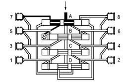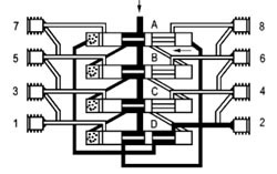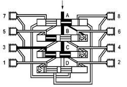 當(dāng)活塞D打通通向活塞A左側(cè)終端的連接通道后,潤(rùn)滑劑流動(dòng)并將活塞A向右推動(dòng)。位于活塞A前右側(cè)的潤(rùn)滑劑輸送到排出口1。