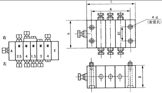 一、概述 JPQ(D)型遞進分配器由首塊A,工作塊M、尾塊E 組成分配器組,工作塊的件數(shù)可根據(jù)需要選擇,最少三件,最多可達10 件,每件工作塊有兩個出油口,因此每一分配器組的出油口在6-20 個之間,也就是每一分配器組可供6-20 個潤滑點,所需供油量的多少,可按型號規(guī)格表列數(shù)據(jù)選用。如果某潤滑點在一次循環(huán)供油中需要供油量較大或特大,可采用圖A3 的方法,取出工作塊內(nèi)部的封閉螺釘,并在出油口增加一個螺堵,使兩個出油口的油量合并到一個出油口。 注意所合并的供油量是工作塊排列中下一個工作塊型號所規(guī)定的供油量(參看工作原理圖)。如果合并兩個出油口的供油量仍然滿足不了需要,可采用圖A4 的方法,增加三通或二通橋式接頭,以匯集幾個出油口的油量來滿足需要。