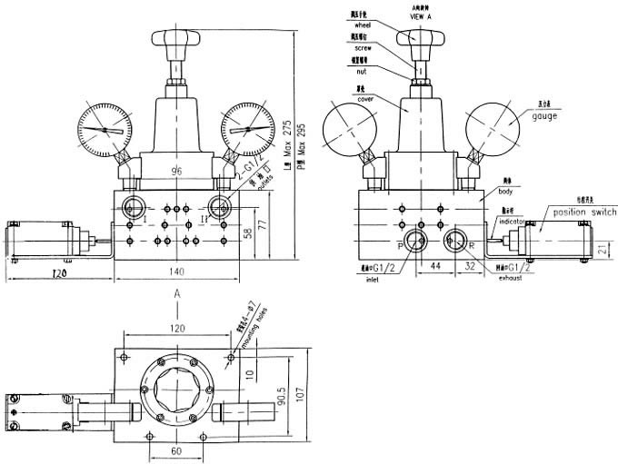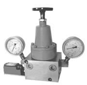 二、功能和結(jié)構(gòu)說明 本閥為二位四通自動液壓換向閥,上平面設(shè)有兩塊壓力表和調(diào)壓手輪。換向壓力由手輪調(diào)節(jié),順時針壓力升高,反之壓力降低。本閥門進油口P與泵出油口連接,回油口R接貯油桶,供油口Ⅰ、Ⅱ分別與兩條供油管路連接。工作時當(dāng)Ⅰ路油壓達設(shè)定壓力,換向閥自動切換到Ⅱ路,這樣潤滑泵就能循環(huán)往復(fù)地向兩條管路供送潤滑脂。 三、技術(shù)參數(shù)