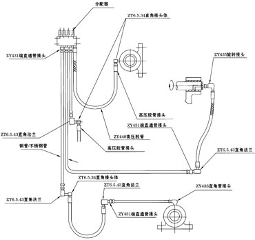 潤滑點可以有固定、移動、旋轉三種不同類型,其配管方法各異。對于固定不動的部件,一般工作場合的配管主要使用銅管,特殊場合則使用不銹鋼管,分配器出口側采用端直通管接頭,軸承側應使用直角管接頭或端直通管接頭。