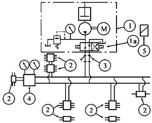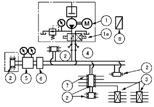 由換向閥 1a 的位置決定潤滑泵①輸出的潤滑劑經兩條供油主管的某一條供送,另一條向貯油器開放。
