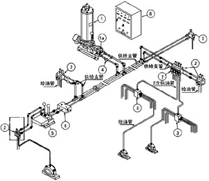 供油主管末端裝有壓力操縱閥或壓差開關閥或二只壓力開關閥(每管線單配)④,當末端壓力達到設定值,向電控柜發(fā)送信號,換向閥 1a 換向,潤滑泵①停止系統(tǒng)一次給油工作完成。經過設定的時間間隔后,系統(tǒng)再次工作,從另一條主油管供油。