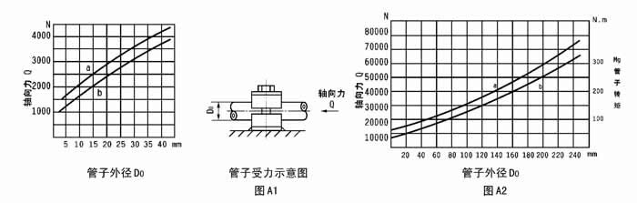 b)尺寸計(jì)算 H=H2+H3+(N-1)·T 式中:N ——管子根數(shù): T ——相鄰管距(見表3),mm; H2、H3見表2和表3 ◎注:組合安裝管夾的每組重量可近似按(N-0.5)乘以表2中的單件重量。 2.1 標(biāo)記說明 A 系列Ⅰ型、管子外徑為12mm的塑料管夾: 塑料管夾A(Ⅰ)12 JB/ZQ4008-97 B 系列Ⅱ型、管子外徑為28mm 的塑料管夾; 塑料管夾B(Ⅱ)28 JB/ZQ4008-97 B 系列Ⅰ型組合疊裝、管子外徑為22mm的3根、管子外徑為28mm的2根的塑料管夾; 塑料管夾B(Ⅰ)22×3-28×2JB/ZQ4008-97 三、管夾承載能力 (A1,A2 及圖A1,圖A2) A1 表示方法:管夾承受管子軸向力的能力大小,用曲線圖表示。 A2 具體內(nèi)容:圖A1 用于“A 系列管夾”;圖A2 用于“B 系列Ⅰ型管夾”。a 曲線表示管夾與管子處于“靜摩擦狀態(tài)”時,管子外徑尺寸與管夾承受管子軸向力的函數(shù)關(guān)系。b曲線表示管夾與管子處于“動摩擦狀態(tài)”時,管子外徑尺寸與管夾承受管子軸向力及轉(zhuǎn)矩的函數(shù)關(guān)系。