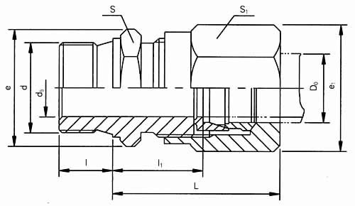 公稱壓力J級(jí),管子外徑D0為14mm的卡套式端對(duì)接直通管接頭: