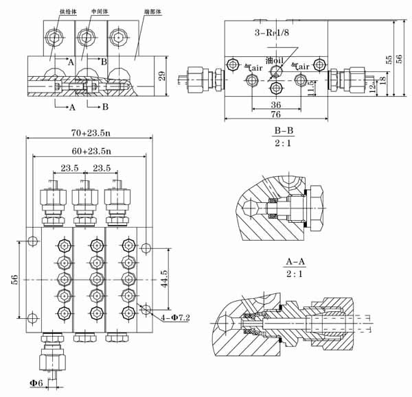 SMX*-YQ型油-氣分配混合器,是由模塊式的單線遞進(jìn)分配器和混合器組合疊加而成。設(shè)有一個進(jìn)油口,二個進(jìn)氣口,3~16個油氣出口。適用于單線二分式油氣潤滑系統(tǒng)和雙線-遞進(jìn)式油氣潤滑系統(tǒng)中。
