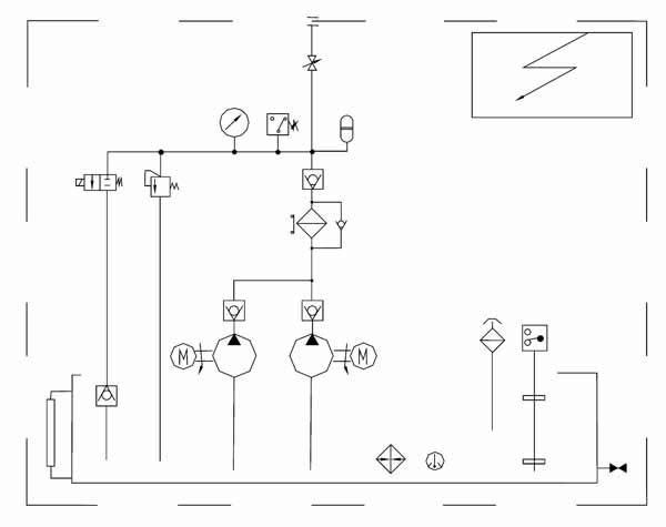 正常工作時,一臺高壓油泵常開工作,另一臺備用,可通過電氣轉換開關來交替使用,并可通過按鈕開關人工啟動和停止油泵,PLC電氣控制箱對油氣系統(tǒng)實行程序化全自動控制,還可向主控室提供系統(tǒng)“運行”、“停止”、“故障”等遠程信號接口。